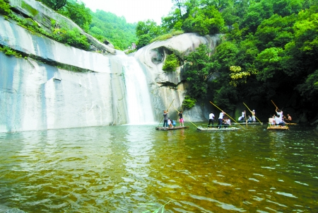 龍?zhí)稖仙角逅?,石奇崖險(xiǎn),頗具登臨之趣。整個(gè)峽谷兩側(cè)是花崗巖山體,一色的蒼青如黛,更顯巨石秀姿。大龍?zhí)陡浇囊粔K巨石酷似鱷魚(yú)頭,正伸入水中飲水,游人稱(chēng)之為“鱷魚(yú)戲水”;“四連瀑”附近有塊巨石更是神奇,從對(duì)面山頭看,猶如豬八戒的頭,像是伸出水面偷看龍女洗澡,人們稱(chēng)之為“八戒窺浴”;從后面看又酷似船頭,因此又叫“船石”;黑龍?zhí)杜赃呌腥龡l極像鯊魚(yú)的巨石,魚(yú)頭伸向潭水,美其名曰“三鯊鬧龍?zhí)丁?。此外,還有“絕壁掛雪”、“神龜過(guò)江”、“鯉魚(yú)跳龍門(mén)”等。奇石遍布,形態(tài)各異,惟妙惟肖,渾然天成。